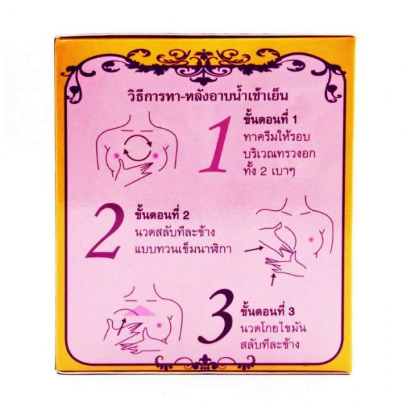 Способ применения: на чистую сухую кожу груди нанести небольшое количество крема. Кончиками пальцев обеих рук нежно втирайте крем в кожу от основания груди к её внутренней стороне, далее, к вершине круговыми движениями, а затем от основания груди к её верхней части. Массаж продолжать в течение 5-10 минут до максимального впитывания крема. Остатки крема смывать не рекомендуется.