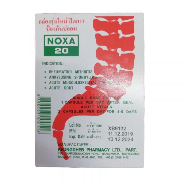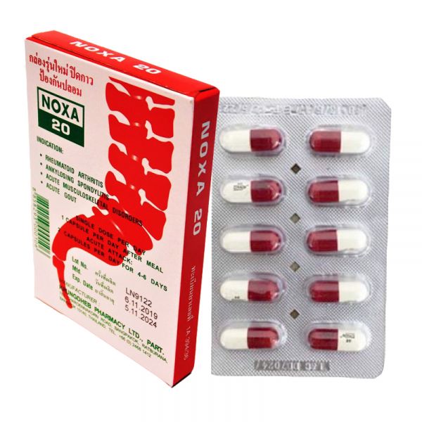 Тайский препарат Noxa 20 для снятия боли в суставах и позвоночнике с противовоспалительным и обезболивающим действиями. Капсулы Noxa 20 ослабляют или купируют воспаление и боль в суставах в покое и при движении, уменьшат утреннюю скованность и припухлость суставов, способствует увеличению объема движений.