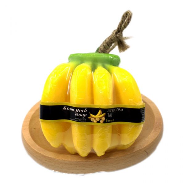 - Банановое мыло. в состав которого входит банановое масло. Мыло замечательно увлажняет кожу, мягко очищая ее, придавая ей гладкость и бархатистость. Этот чистейший продукт, обладает антисептическими и антибактериальными свойствами. При использовании бананового мыла образуется нежная, воздушная пена, которая приятно распределяется по Вашему телу, не оставляя сухости на коже. Мыло имеет приятный, сладковатый аромат банана.