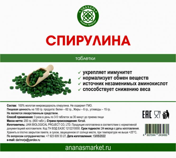 Укрепляйте иммунитет при помощи Спирулины в таблетках. В упаковке около 800 таблеток общей массой 200 г. Водоросль спирулина обладает антиоксидантным эффектом, способствует быстрому восстановлению организма после вирусных и бактериальных инфекций, снимает сонливость и улучшает работу кишечника.